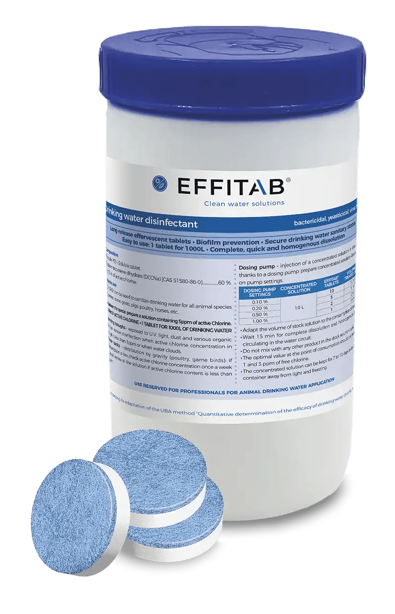 Effitab® je plně účinný za následujících podmínek: Pro jakýkoliv druh připravte roztok s obsahem 5 ppm aktivního chlóru. 5 ppm aktivního chlóru: 1 tableta na 1 000 L pitné vody.